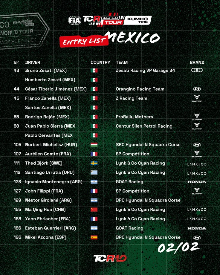 El listado oficial ya fue publicado: 24 autos del serial mundial estarán en la pista, junto a 25 pilotos del TCR México, que darán su máximo esfuerzo para poner en alto el nombre de nuestro país. México tendrá presencia en cada curva, en cada aceleración y, sin duda, en la lucha por los primeros lugares.
