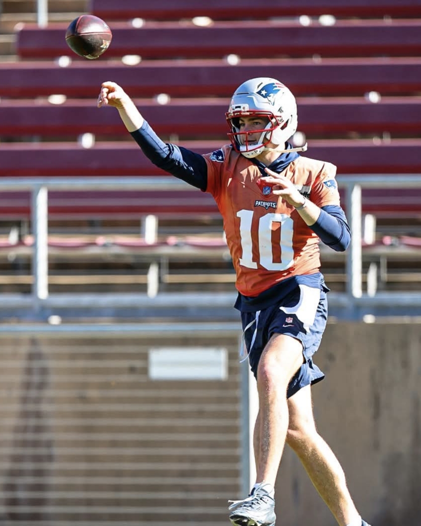 Drake Maye participó durante toda la práctica, a pesar de la lesión que reporta en el hombro de lanzar.
